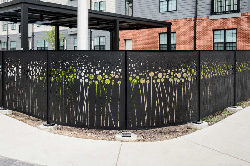 REVAMP steel laser-cut metal Fence Topper/Screening Colorado College, Colorado Springs, CO. Project included fence & screening elements, fence toppers for existing enclosure and custom enclosure gates.
